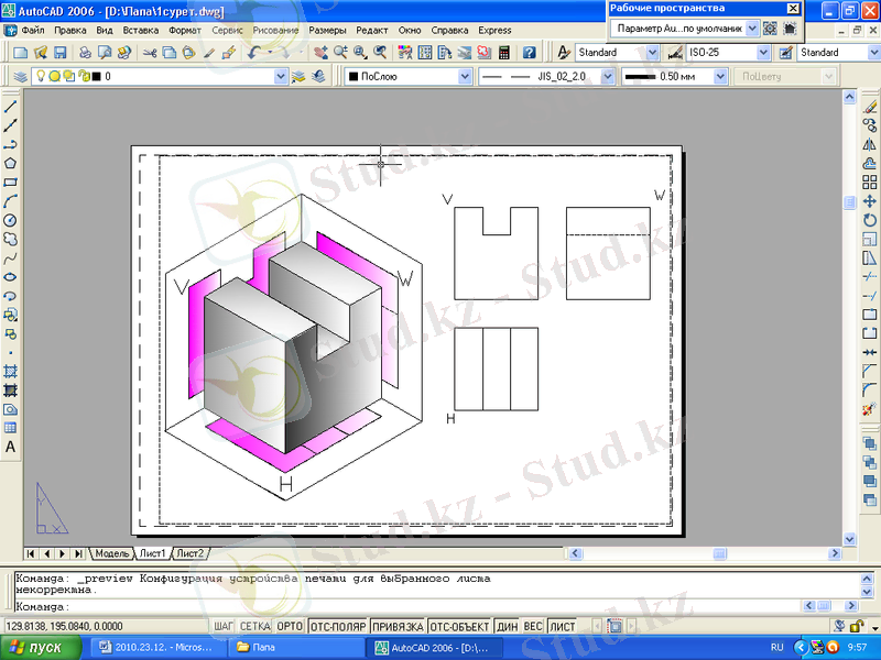 Сызбаны шығарып алу үшін W жазықтығын оңға қарай 90 0 -қа, ал Н жазықтығын төмен қарай 90 0 -қа бұрады. Осындай жолмн табылған сызба нәрсенің тік бұрышты үш проекциясынан: фронталь, горизонталь және профиль проекциясынан тұрады. Проекция осі мен проекциялаушы сәулелер де сызбада көрсетілмейді.