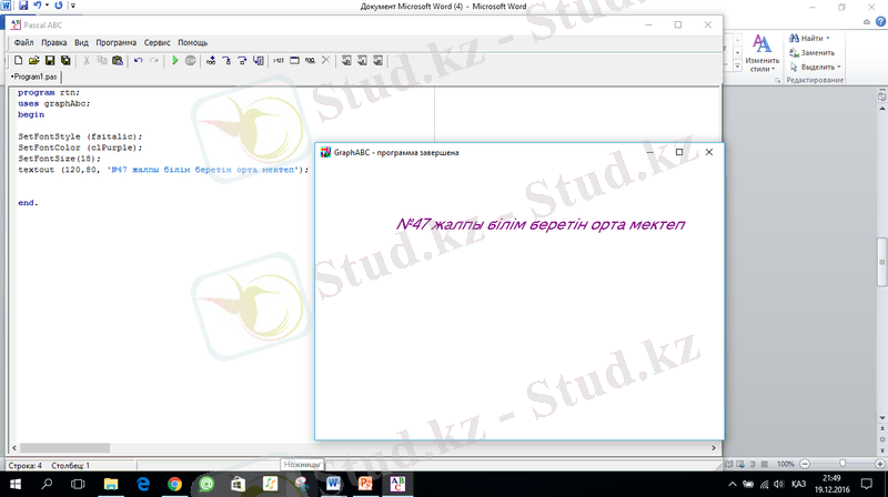 Білімділігі: Оқушыларды Паскаль тілінде графиктік режимде мәтін жазу тәсілдерімен таныстыру.