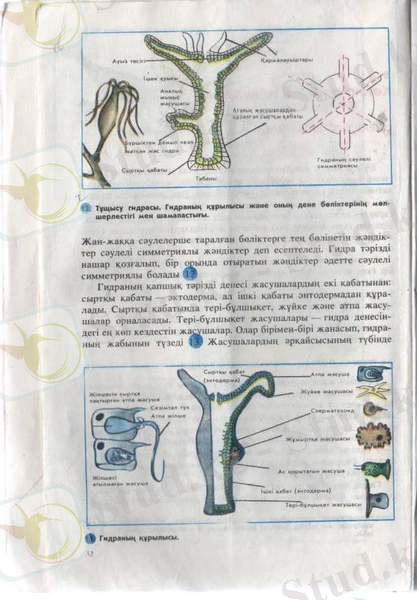 2 . Сынауықтағы су өсімдігіне жабысып тұрған гидраны ұлғайтқыш әйнекпен қарау. Гидраның сыртқы құрылысымен танысу. Гидраның қалай бекінгенін анықтап қарау. Дәптерлерге суретін салу. Гидраның қармалауыштарын жазып, созылуы да, бүрісіп домалана жиырылуы да мүмкін. Екі жағдайды анықтап көріп, дәптерге бейнесін сызып алыңдар.
