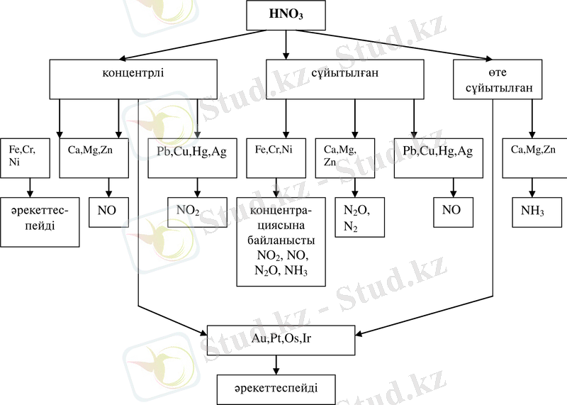 - Cұйытылған азот қышқылы металдармен ( Fe, Cr, Ni ) әрекеттескенде шығатын өнімдеріді атап көрсетіңдер.