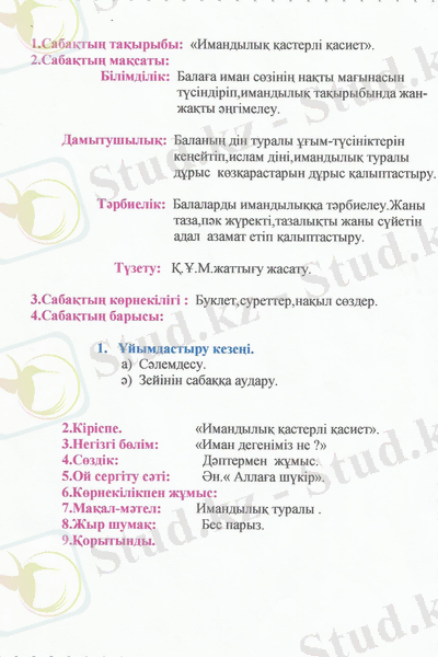 имандылыққа тәрбиелейді. Ислам дінінің негізгі бес парызы бар. Олар: 1. Иман.