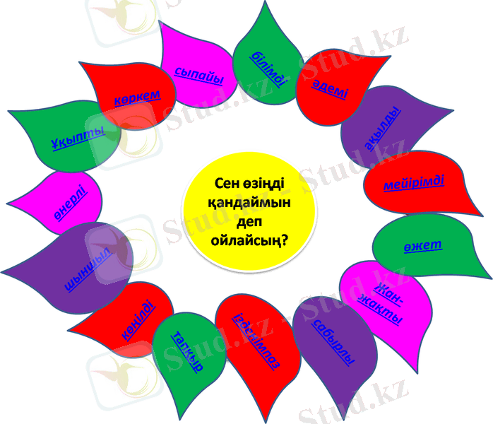 Армысыздар, құрметті ұстаздар мен оқушылар! Сіздермен бірлесе отырып, бүгін біз “ WordPad -та мәтінді пішімдеу” атты сайыс сабағымызды бастауға рұқсат етіңіздер. Сабақ 6 кезеңнен тұрады. Оқушылар «Сен өзіңді қандаймын деп ойлайсың?» деген гүлтәріздес слайдта адам қасиеттерін таңдау арқылы жұптық топқа бөлінеді.