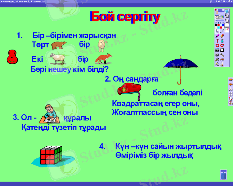 Көрнекілігі: Интерактивті тақта, компьютер, кеспе қағаздар