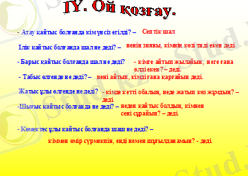 Зат есімнің септелуі туралы түсінік беру. Септік жалғауларымен таныстырып, олардың сұрақтарын меңгерту.