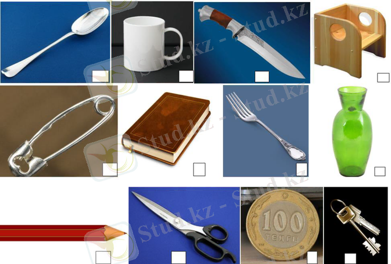Суретке мұқият қараңыз. Магнитке тартылатын заттардың суреттерінің тұсына (˅) белгісін қойыңыз. Олар магнитке неліктен тартылады деп ойлайсыз?