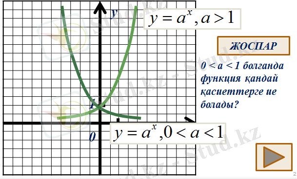 Көрсеткіштік функция қасиеттерін анықтап келу