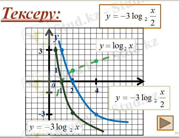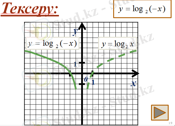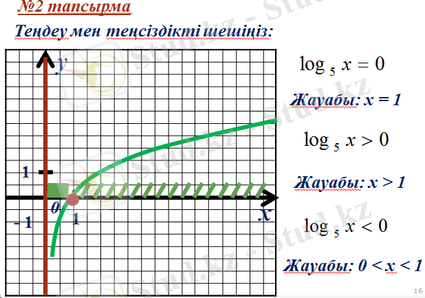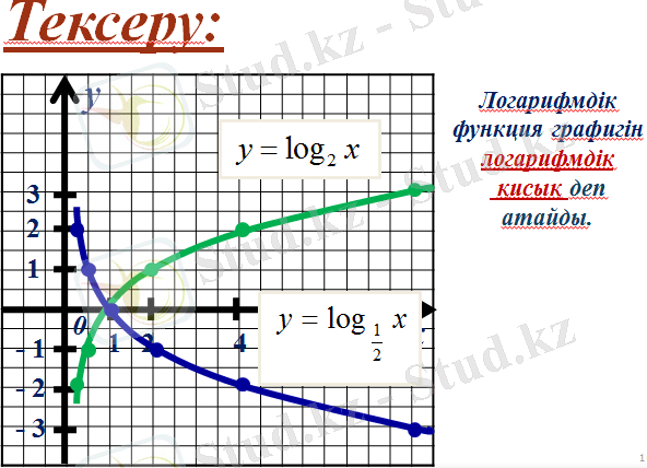 - МН10. 15 y = ax(a> 0, a ≠ 1) көрсеткіштік функцияға кері функция y = loga(x) логарифмдік функция екенін түсінеді