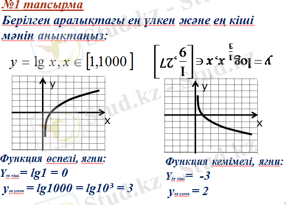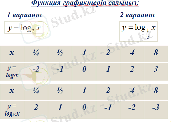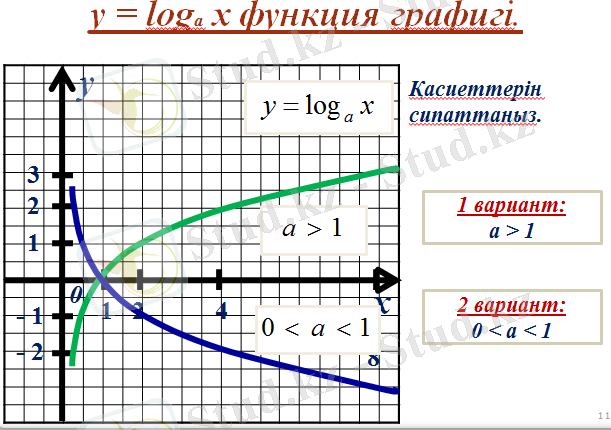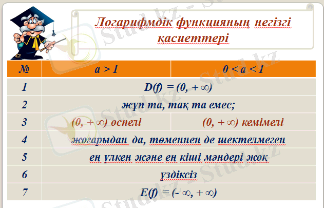 y = log a (x) логарифмдік функция екенін түсініп, осы екі функцияның қасиеттерін қарастыру. Қарастырған қасиеттерін есептер шығару барысында қолдана білу.