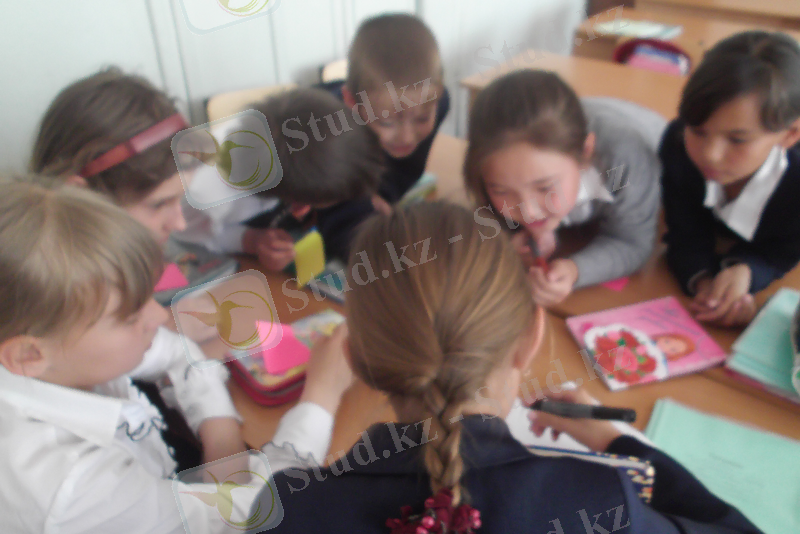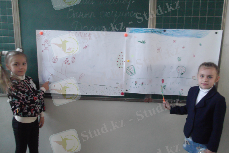 Келесі «Күз» тақырыбында «Күзгі бақ» деген тақырыпқа сурет салуға тапсырма бердім, және әрбір топ мүшесі 1 сөйлеммен айтқанда сөйлемдер бір-бірімен байланысып, шағын мәтін құрылу керек. Топтарды бақылап отырсам бос отырған оқушы болған жоқ. Біреулері сурет салып жатса, біреулері сөйлемдер құрау үшін өз ойларын айтып қызу жұмысқа кіріскен, осы көрініске қарап өзімде керемет қуаныш сезімі пайда болды. Ал тапсырманы орындамау барысында Ташке мен Ермолинка Анастасияның сурет салуға талантты екендігін байқалды. Ал Еңілік пен Ескендір оларға жақсы идеялар айтып, көмектесіп отырды. Соңында құрған мәтіндерін 2 топтан Дюсмекеева Настямен, Арон шығып оқыды. Бұл тапсырма әдісімен топ мүшелері ортасында ынтымақтастық әрекеті өте жақсы қалыптасты, сонымен бірге қызу бірлескен жұмыста болды.