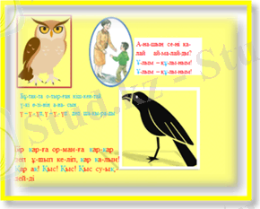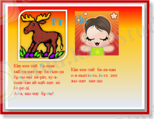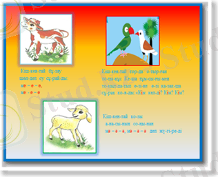 Қане, балалар, енді сендердің қазақша әріптерді қаншалықты нақышына келтіріп айтатындарыңды тексеріп, көрейін. Қазақ тіліне тән дыбыстарды қайталаймыз. Сосын мұғалім сұрақ қояды, балалар жауап береді.