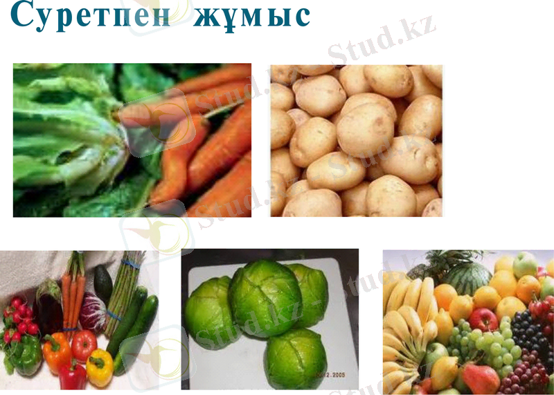 2-деңгей Суреттегі жемістер мен көкөністерді қатыстырып сөз тіркесін құрау.