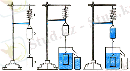Тәжірибе жасайық (3-сурет) 1 серіппеге кішкентай шелек (қаушақ) 2 және цилиндр формалы денені 3 ілейік. Штативтегі көрсеткіш-тілшенің орнын белгілейміз (3, a -сурет) де, денені су құйылған ыдысқа төгілетін түтікке дейін батырамыз. Бұл кезде суйықтың біраз бөлігін дене ығыстырып шығарады да ол стаканға төгіледі (3, б -сурет), оның көлемі дененің көлеміне тең. Осы кезде сұйыққа батырылған дененің салмағының азайғандығын серіппенің көрсеткішінің жоғары көтерілуі білдіреді.