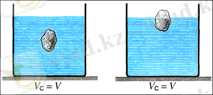 Бұл көлем дененің сұйыққа батып тұрған бөлігінің көлеміне тең болады. Егер дене сұйыққа толығынан батып тұрса, онда сұйық көлемі дене көлемімен V бірдей болады, ал егер жарты бөлігі батып тұрса, онда дене көлемінен V аз болады (4-сурет) .