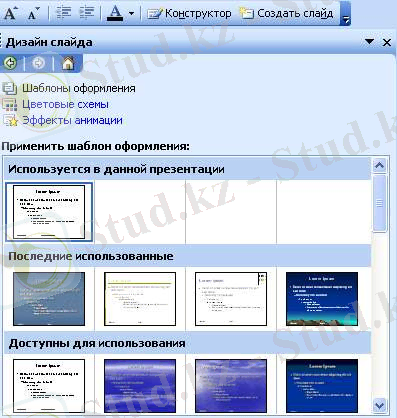Шаблондарды пайдаланып құру әрекетін POWER POINT программасы іске қосылған мезетте ашылған сұқбат терезеде Презентациялар шаблоны (шаблон презентаций) опциясын таңдау арқылы құру мүмкіндігі бар немесе Формат - слайдты көркемдеу (Формат - Оформление слайд) командасын орындап құруға болады. Осы опция таңдалғаннан кейін Жалпы (Общие ), Презентациялық дизайндары (Дизайны презентация) , Презентациялар, Web- парақтар ( web-страницы ) астарлы беттерінен тұратын, Презентацияны құру сұхбат терезесі ашылады. Осы сұхбат терезе Файл- Құру командасын орындағаннан кейін де ашылады. Презентацияның шаблоның тышқан көмегімен белгіліген кезде шығатын үлгіден қарап отырып, өзімізге ұнағанын таңдап ОК батырмасын шертеміз. Осы мезетте экранға Слайд құру сұхбат терезесі шығады. Бұл сұхбат терезеде қажетті слайдтың түрін көрсетуіміз қажет. Экранда таңдалған шаблонға сәйкес бос презентация пайда болады. Осы презентацияға тиісті мәтіндерді енгізіп, арнайы эффектілер қосып, көрекмдейміз.
