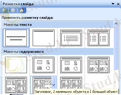 - Слайд белгіленуі(Разметка слайда) . Слайд белгіленуі ретінде слайдқа орналастыратын мәтін, сурет, диаграммалар т. б. формасын айтуға болады.
