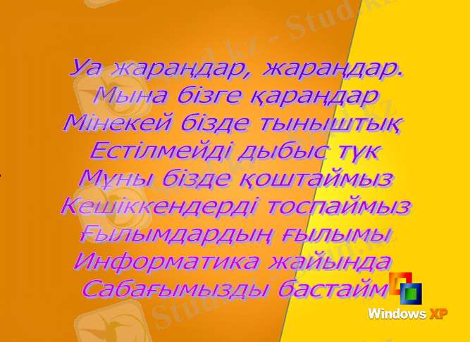 - Оқушылар, бүгінгі біздің сабағымыздың ерекшелігі мен сендерді әрбір тапсырманы орындағаннан кейін бағалап отырамын. Сабақтың соңында алған бағаларынды қосып қорытынды баға шығарамын.