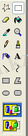 - Кез келген аймақты бөліп алу құралы, белгілеу құралы, өшіргіш, құю құралы, түс таңдау құралы, масштаб құралы, қарандаш, қылқалам, бүріккіш, жазу, түзу сызық сызу құралы, қисық, тік төртбұрыш, көпбұрыш, эллипс, бұрыштары дөңгеленген тік төртбұрыш.