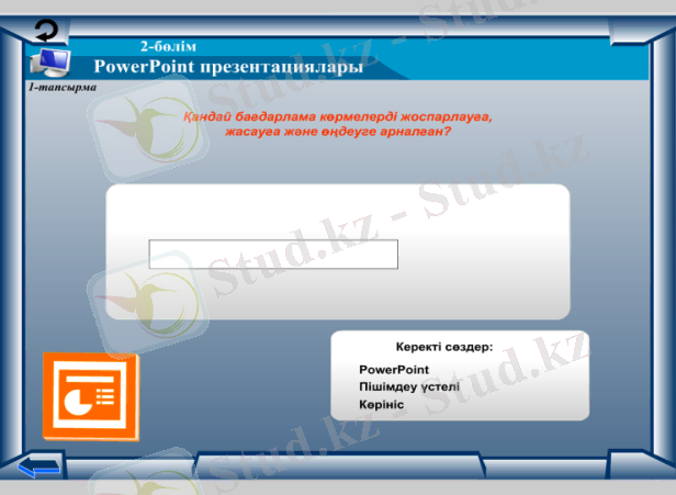 1-тапсырма: Қандай бағдарлама слайдтарды жасауға және өңдеуге арналған?(Тиісту бағдарламаны таңдау)