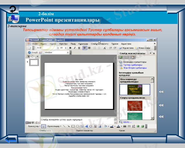 Сабақтың мақсаты: Оқушыларға Power Point бағдарламасында жұмыс істеуді меңгерту.