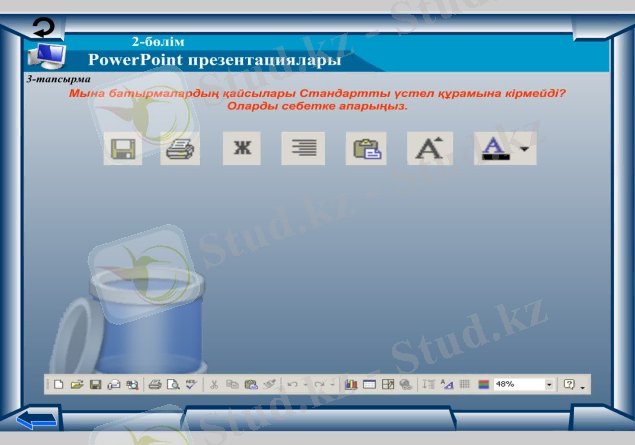 3-тапсырма: Мына батырмалардың қайсысы Стандартты үстел құрамына кірмейді?Оларды себетке апарыңыз.