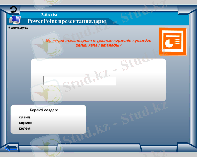 -Белгілі бір тақырып бойынша бірыңғай стильде безендірілген слайдтардың және тиісті жолдама материалдарға (презентация жоспарына, баяндамашы ескертпелеріне, тыңдаушыларға үлестірілетін материалдарға) сәйкес келетін слайдтардың жиынтығы презентация деп аталады.