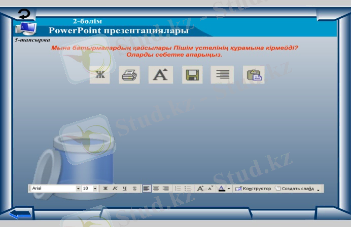 5-тапсырма: Мына батырмалардың қайсысы пішімдеу үстелінің құрамына кірмейді?оларды себетке апарыңыз.