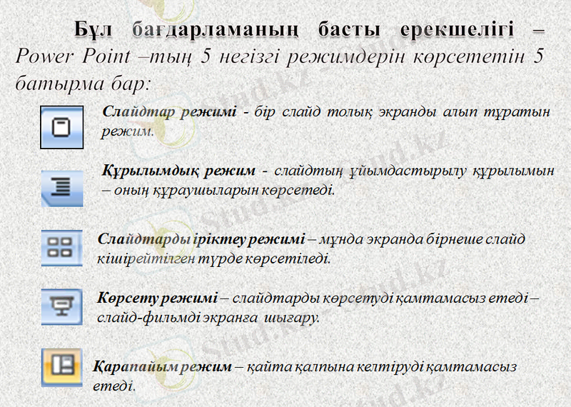- Студенттер білу керек:MS POWER POINT , атап айтқанда слайдтарға мәтіндерді жазуды, түстер мен түрлі терезе құрылымдарын қолдануды, мәзірлермен жұмыс істеуді.