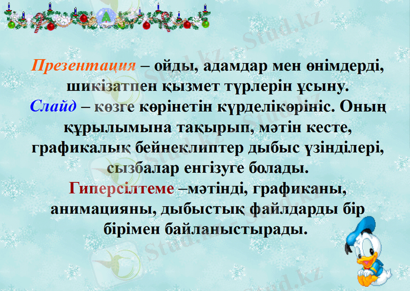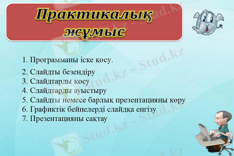 - Студенттер меңгеру керек:Презентацияға түрлі өзгерістерді енгізіп, анимация және сілтеме жасау жұмыстарын жүргізуді.