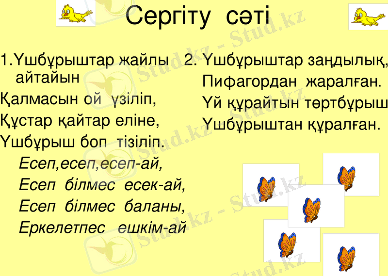 Көрнекілігі: тест тапсырмасы, үшбұрыштар туралы өлең, слайд