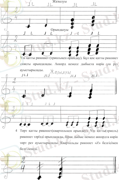 - Жәй рикошет. Жәй рикошет көріктің бірқалыпты жазылуы мен жиналу қозғалысы арқылы жасалады. Көрік бағытын ауыстыру кезінде саусақ түймеде ажыратылып, ноталардың ұзындығы толығымен сақталады.