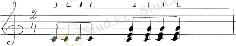 Онда үш бөлмедегі он алтылық ноталарды дәл алып, бас партияны қосып, көрікті ашып, жабу әдісімен қатар, қолдың күш қимылымен жұмыс жасалады.