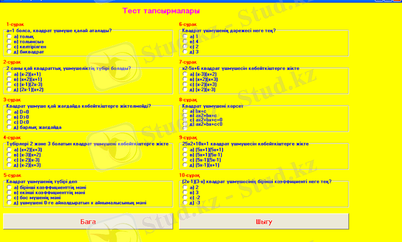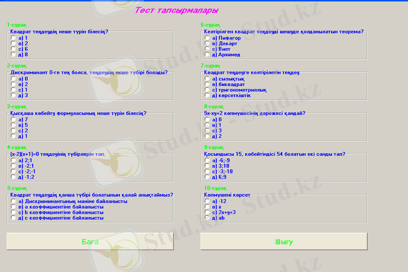 Оқушылар жабық тест тапсырмалары түрінде құрастырылған сұрақтарға компьютер арқылы жауап береді. Нәтижесін бірден алу мүмкіндігі қарастырылған.