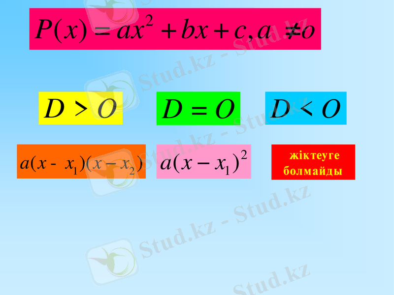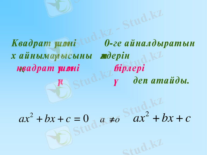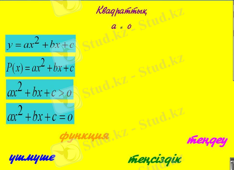 Білімділік: оқушыларды квадрат үшмүше және оның түбірлері ұғымдарымен таныстыру, оқушылардың квадрат үшмүшені көбейткіштерге