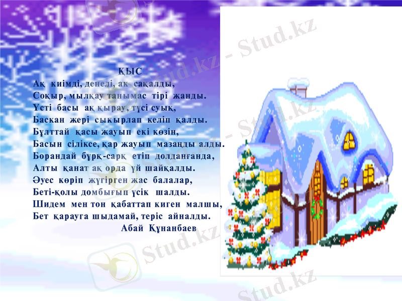 II. Тірек білімдерін жетілдіру. Қызығушылықты ояту . Бүгінгі сабақта қыс қызығына батамыз. Сабағымды Абай Құнанбаевтың «Қыс» өлеңімен бастағым келіп тұр.