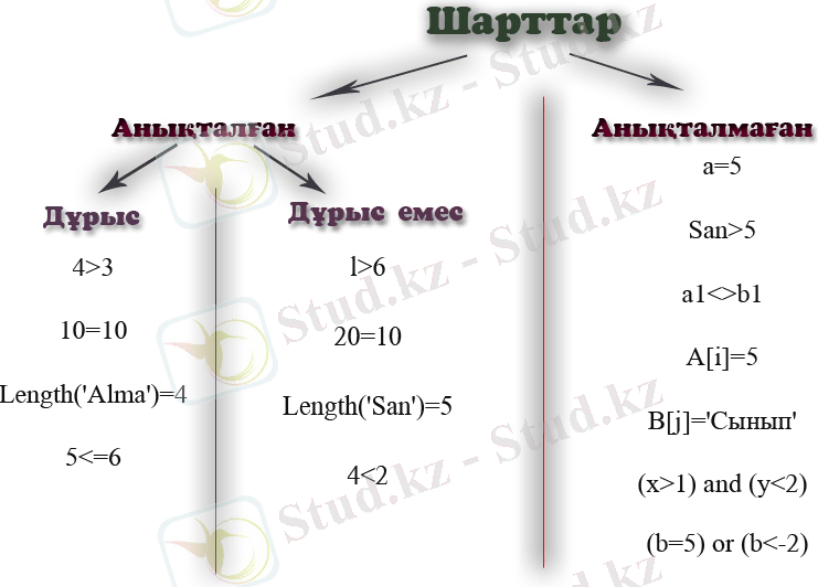 - Анықталған шарт: 4>3, 2=5, length(‘Боран’) =5, 3≠3,