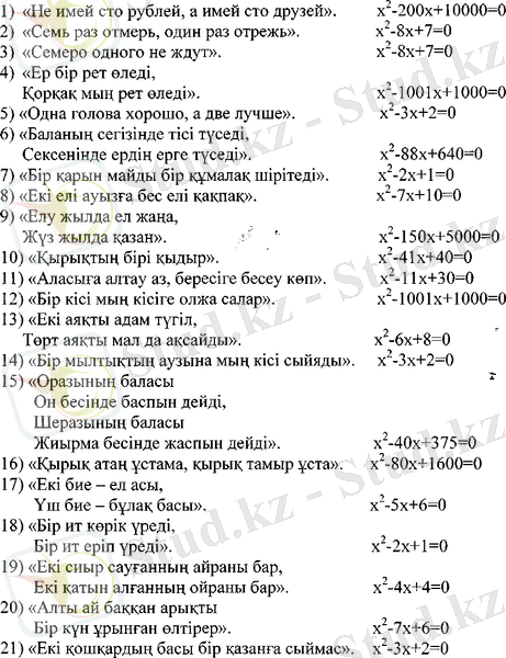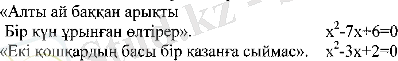 -квадраттық теңдеу шешімдерінің қасиеттерін қазақтың мақал-мәтелдеріне сәйкестігін анықтап, сипаттап, жеткізе білу.