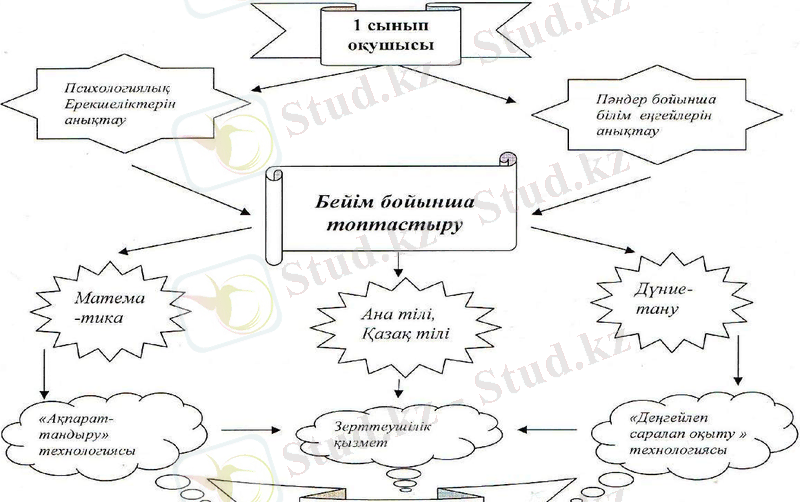 Жапонияның таңдай қақтыратын жетістіктері орта білім беруді реформалаудан басталды. Олар 12 жылдық білім берудің 6+3+3 =12 үлгісін қолдана отырып, дамудың биік шыңына шықты. Осы үлгіде бастауыш буынға 6 жылдық оқу мерзімі берілген. 6 жылдық бастауыш мектебі бар жапондық білім беру жүйесі мемлекеттің озық жағдайын қамтамасыз етуге мол үлес қоса отырып, өзінің алдына қойылған жауапты міндетін зор абыроймен орындап шықты. Жапондықтар өздерінің -негізгі қызметі ана тілін берік әрі түбегейлі меңгеруі-жапондық рухты терең қалыптастыра алатын 6 жылдық бастауыш мектебімен байланысты деп есептейді, ал білім берудің бұдан кейінгі буындары мен деңгейлері әлемдік мәдени және ғылыми -техникалық жетістіктер де терең меңгеріліп, мемлекетті әлемдік өркениеттің өріне көтеріп отыр. Заңғар жазушы Мұхтар Әуезов «Халықты халықпен теңестіретін-білім» дегендей елімізді өркениетті -Жапония, Англия, АҚШ сияқты елдер қатарына теңестіруде оқытудың негізін бастауыш сатысынан терең қалап, әр оқушыны 1- сыныптан бастап бейімдеп оқытуға бағыттау қажет деп ойлаймын. Ал мектеп табалдырығын жаңа аттаған оқушының білім, білік дағдыларды игеруіне ықпал ететін оқу әрекетін ұйымдастыру, оқуға, жазуға, есептеуге машықтандыру, шығармашылық ойларын дамыту бастауыш сыныптан қамтамасыз етіледі. Осыдан оқушыларды «Қалай оқыту керек?» деген сауал туындайды. Бастауыш сынып сатысының ерекшелігі мектепке қабылданған оқушылардың дайындық деңгейінің, психологиялық, физиологиялық жағынан әр түрлі болуында. Сондықтан бастауыш мұғалімінің қызметі әр баланың жеке ерекшелігіне қарай жағдай жасау үшін тұлғалық, бағдарлы болуға тиіс. Бағдарлы бейіндеп оқыту қала мектептерінде тиімді жағдайда жүргізілуде, ал шағын оқушысы бар ауыл мектептерінде бағдарлы бейіндеп оқытуға дайындықты бастауыш мектептен бастау үшін мұғалім ең алдымен бірінші сыныпқа келген оқушының қабілетін, зейінін, түйсігін, бейімділігін анықтау үшін мектептегі психолог маманмен бірлескен түрде жұмыс жасап, әр түрлі психологиялық тест тапсырмаларын алу керек. Екінші кезекте мұғалім оқушыларды арнайы дайындалған: математика, қазақ тілі, ана тілі, дүниетану сияқты негізгі пәндер бойынша оның жас ерекшелігін ескере отырып пәндік тестпен қабылдап, қорытындысы бойынша семантикалық карта жүргізіп, оқушының білім деңгейін мониторингке түсіру қажет. Осы жүргізілген зерттеу (бақылау) жұмыстарынан кейін сынып оқушылары бейімділіктеріне қарай топтастырылып (іріктеліп), 1, 2, 3 қатарға отырғызылады. Бұл оқушыларды әр пән бойынша деңгейлік тапсырмаларды орындап, шығармашылықпен жұмыс жасап, өздігінен іздене білу қабілеттерін арттырады. Яғни;