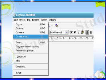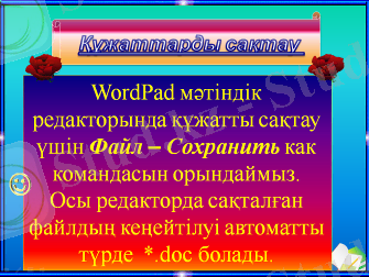 WordPad мәтіндік редакторында құжатты сақтау үшін Файл - Сохранить как командасын орындаймыз. Осы редакторда сақталған файлдың кеңейтілуі автоматты түрде *. doc болады.