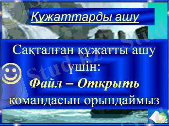 Сақталған құжатты ашу үшін: Файл - Открыть командасын орындаймыз