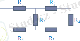 Тізбектің жалпы кедергісін табыңдар R 4 =24 Ом, R 3 =20 Ом, R 1 =R 2 =R 5 =R 6 = 3 Ом. (10 ұпай)