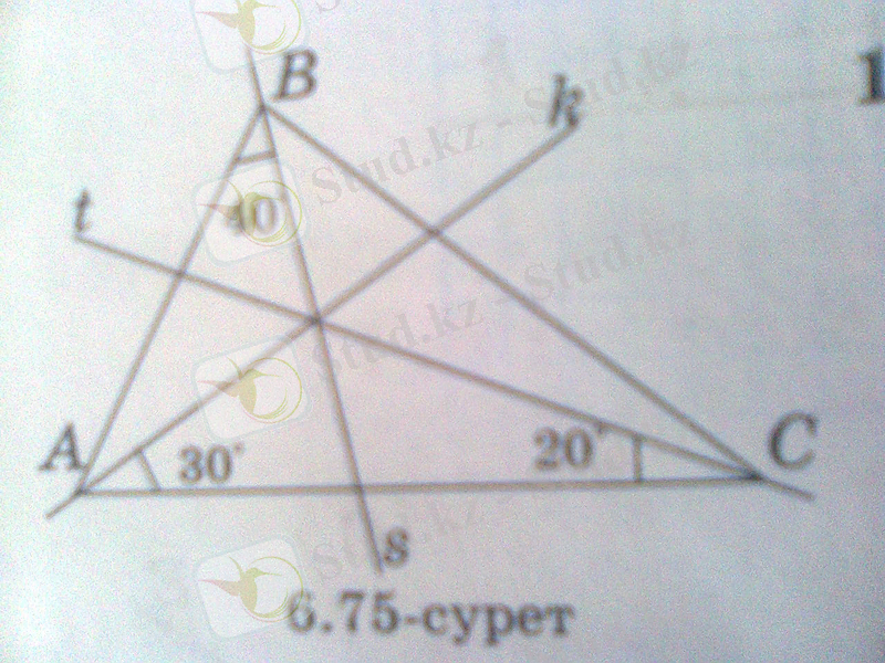 «С» тобы. №1186. 6. 75-суреттегі АВС үшбұрышының В бұрышының, А бұрышының, С бұрышының биссектрисалары оларды градустық өлшемдері 40 0 ; 30 0 ; 20 0 бұрыштарға бөледі. В, А және С бұрыштарының градустық өлшемдерінің қосындысы неше градус?