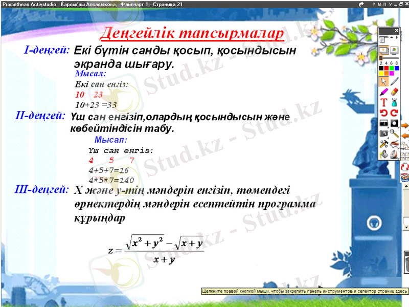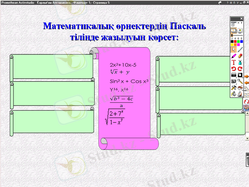 Б) «Матеатикалық өрнектерді аудару» бұл тапсырмада оқушылар математикалық өрнектерді Паскаль програмалау тіліне аударады.