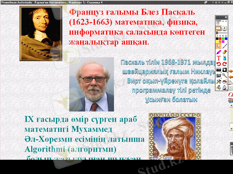Ә) «Ұлы ғалымдар» Интерактивтік тақтаның «прожектор» құрылғысын қолдана отырып ұлы ғалымдардың фото суреттерін көрсету арқылы оқушылар олардың кім екенін аңықтайды?