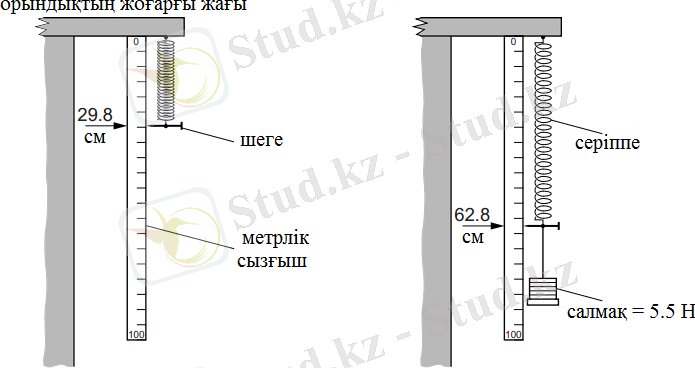 Серіппеге жүк асылмастан бұрын шеге метр сызғышта 29. 8 см белгіні көрсетеді. Серіппеге 5. 5 Н жүк асылғаннан кейін шеге 62. 8 см болатын нүктені көрсетеді.