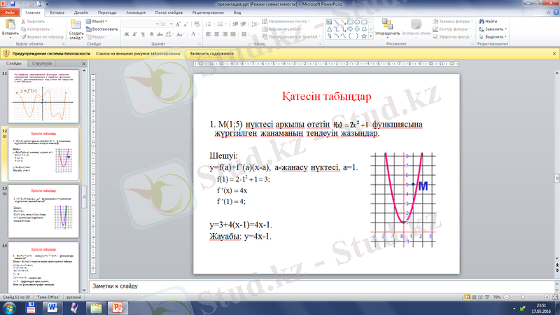№1. Қай нүктеде функциясының графигіне жүргізілген жанама абсциссалар осімен 60 0 бұрыш жасайды?