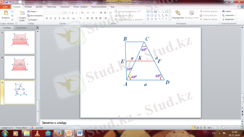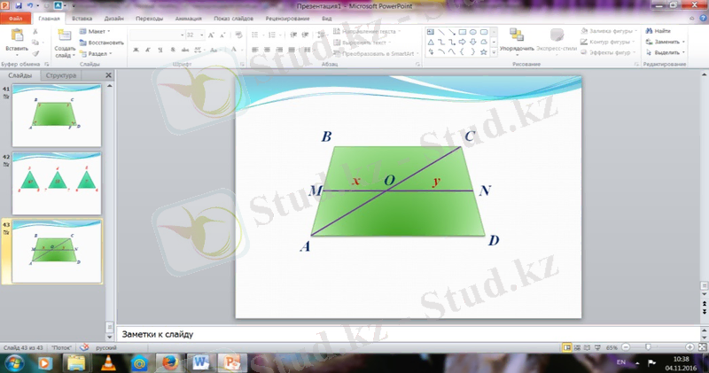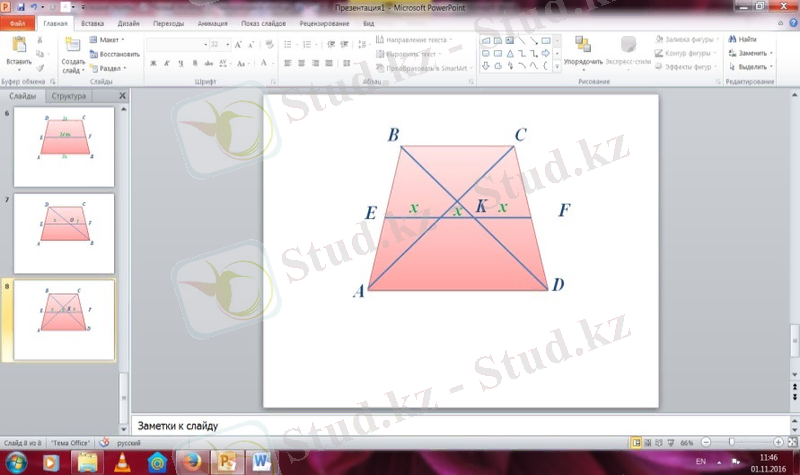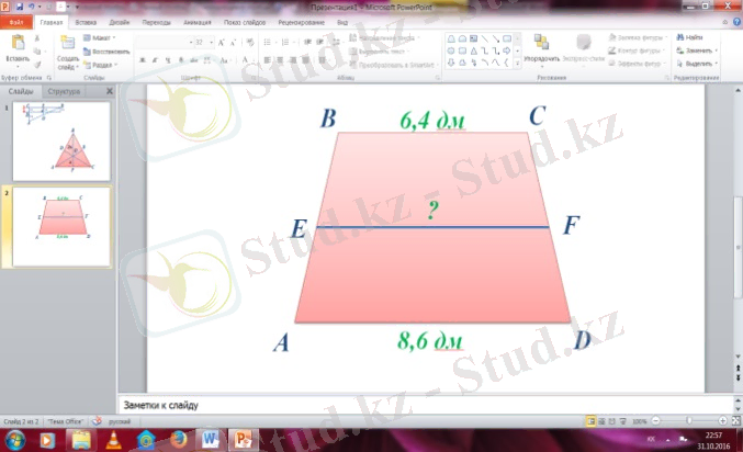 Сабақ мақсаты: Теоремаларды дәлелдеу арқылы үшбұрыш және трапецияның орта сызықтарын табуды үйрену, тақырыптың мазмұнын игеру арқылы, топпен талқылау арқылы ойын толық жеткізіп сөйлеу дағдылары мен жазбаша тілдерін жетілдіруге дағдыланады.
