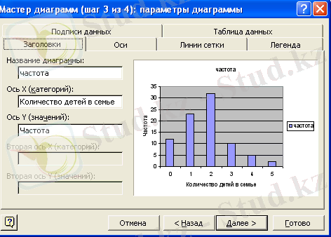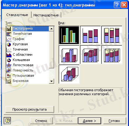 Диаграмма құру барысында Кері (<Назад) батырмасы арқылы шегініс жасап, реттеп отыруға мүмкіндік бар, немесе Әрі қарай (>Далее), соңынан Дайын (Готово) батырмасын басу арқылы жасап отырған диаграммамызды аламыз.