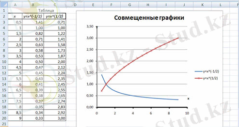 Функция y1=x^(-1/2) , y2=x^(1/2), аралық [- 0, 5 ; 9], қадам0, 5.