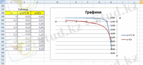 Функция y1=x^(-3), y2=3/x, аралық [- 5 ; -0, 5], қадам 0, 5.