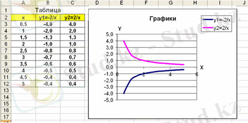 Функция y1=-2/x, y2=2/x, аралық [0, 5 ; 5], қадам 0, 5.